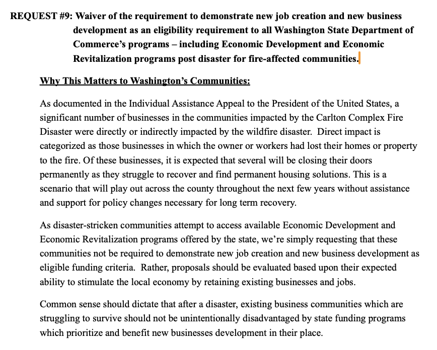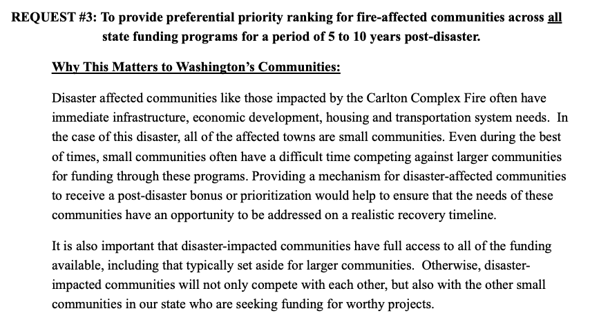 The wildfire and fire-related flooding events in Okanogan County during the summer of 2014 brought to light several important opportunities for the State of Washington to proactively shape policy such that the State and communities of Washington State were better prepared for future natural disasters. During the 2015 Legislative Session, the Long Term Recovery Organizations active in Okanogan County worked collaboratively to identify policy initiatives and encouraged the Legislature of the State of Washington to take action for the benefit and future of WA State communities. Recommendations were presented at a hearing in Brewster, WA in January 2015 in the form of the “Simple Steps for a Stronger Future” document (examples seen below). Advocating for community member voices and needs required collaboration and a unified message. Eleven clearly stated requests were brought forth and many of the requests were implemented.